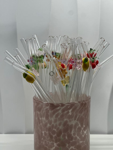 Unsere wiederverwendbaren Glashalme sind nicht nur nachhaltig, sondern auch ein echter Hingucker! Jeder Halm ist aus robustem, hochwertigem Glas gefertigt und mit liebevollen Motiven wie zum Beispiel Kirschen, Zitronen, Schleifen und vielen weiteren Designs verziert.
